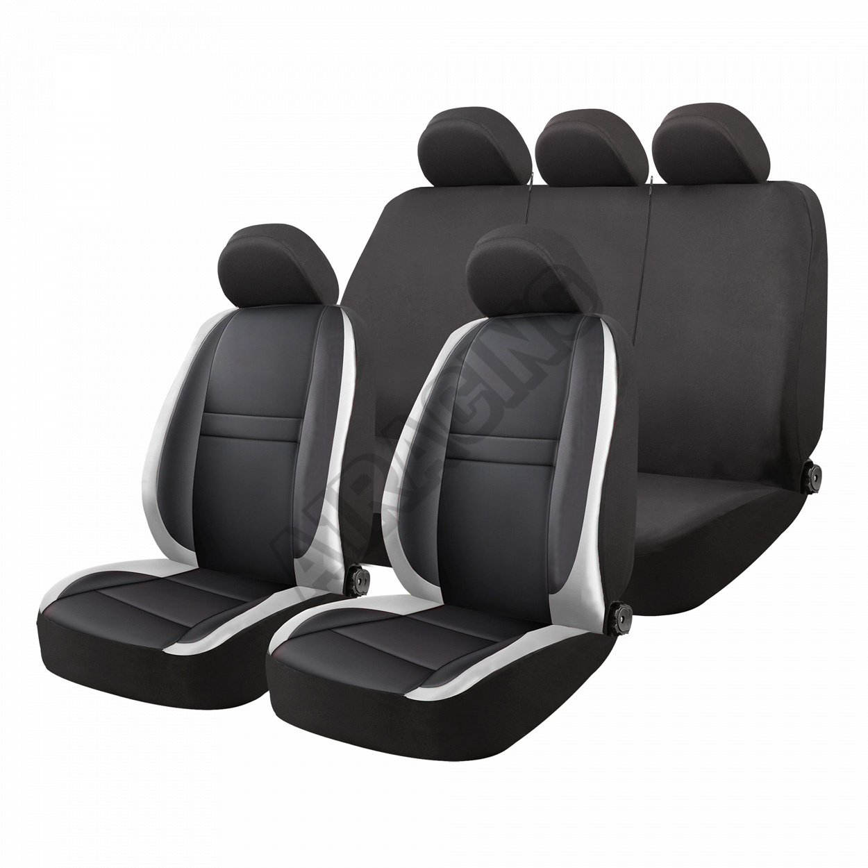 Sada 9 kusů zahrnuje potahy na dvě přední sedadla, dělenou zadní lavici a sadu opěrek hlavy. Univerzální přizpůsobení pro většinu modelů osobních automobilů.