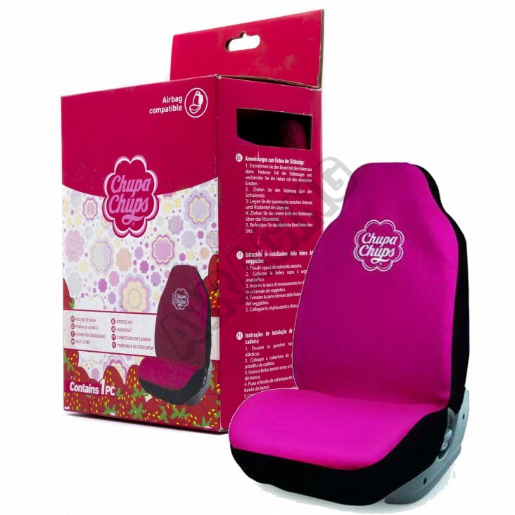 Značkové autopotahy Chupa Chups. Určeno pro většinu modelů aut včetně bočních airbagu. Díky pružnému materiálu lze tyto autopotahy použít skoro do všech aut kromě snad hodně sportovních sedaček, které mají extrémní boční opěrné části.