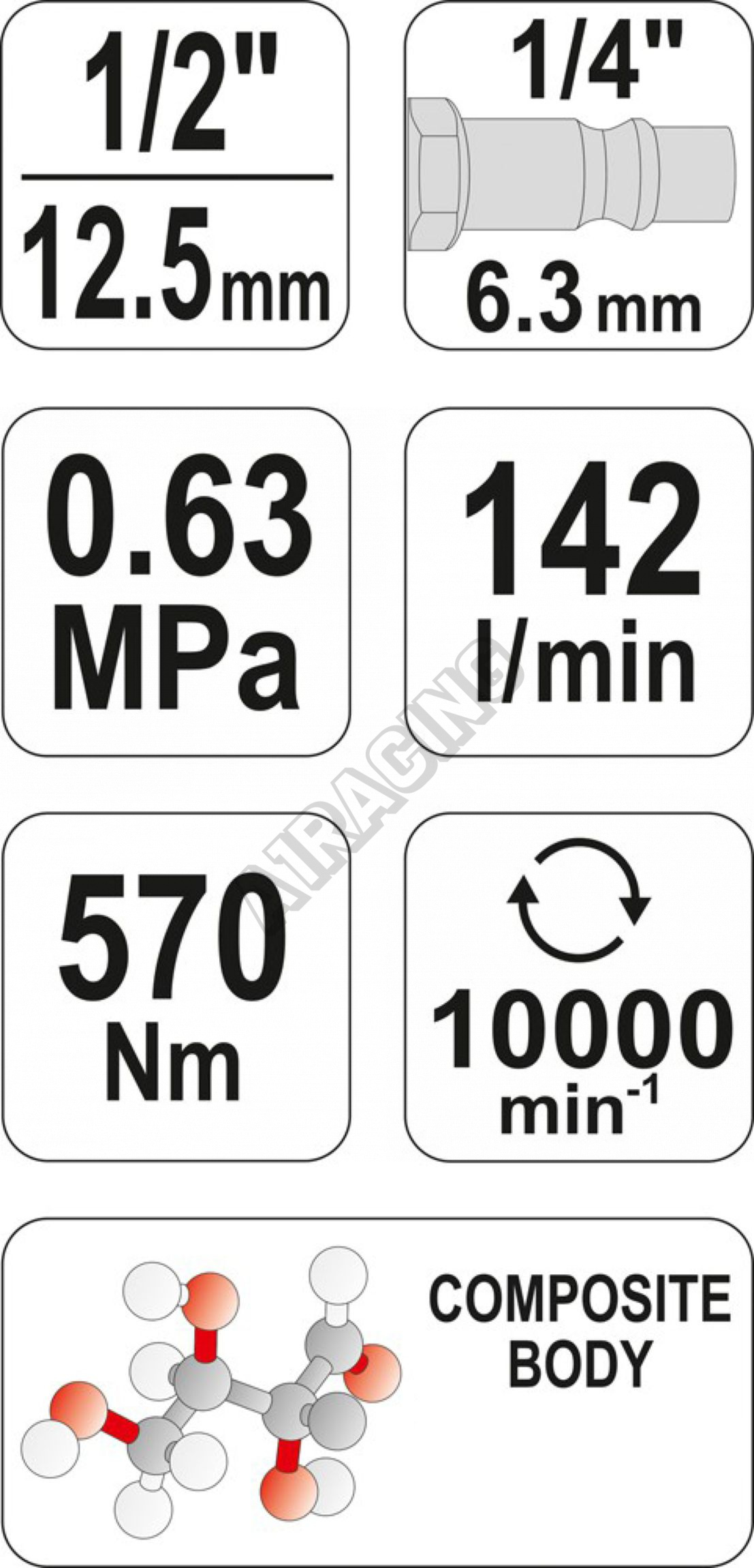 Robustní tělo rázového utahováku je zhotoveno z litého kompozitu a duralu, zabezpečuje dlouhou životnost při použití v průmyslu, v garážích a v dílnách.