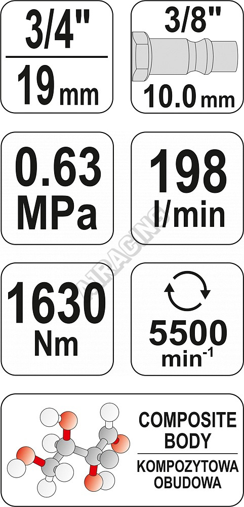 Robustní tělo rázového utahováku je zhotoveno z litého kompozitu a duralu, zabezpečuje dlouhou životnost při použití v průmyslu, v garážích a v dílnách.