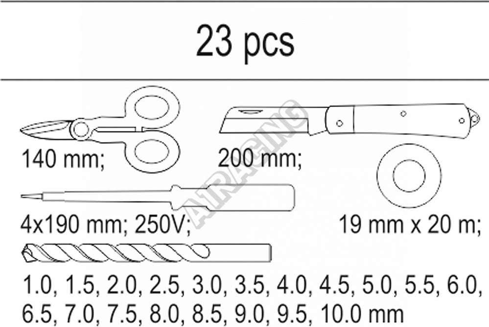 - Sada vrtáků: 1; 1,5; 2; 2,5; 3; 3,5; 4; 4,5; 5; 5,5; 6; 6,5; 7; 7,5; 8; 8,5; 9; 9,5; 10 mm