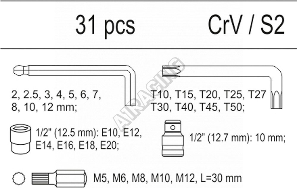 Sada 31 kusů klíčů imbus, torx a spline bity z CrV oceli. Sada je přehledně srovnána ve vložce do zásuvky z PVC.