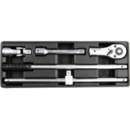 Sada 4 kusů ráčen a nástavců z CrV oceli. Sada je přehledně srovnána ve vložce do zásuvky z PVC.