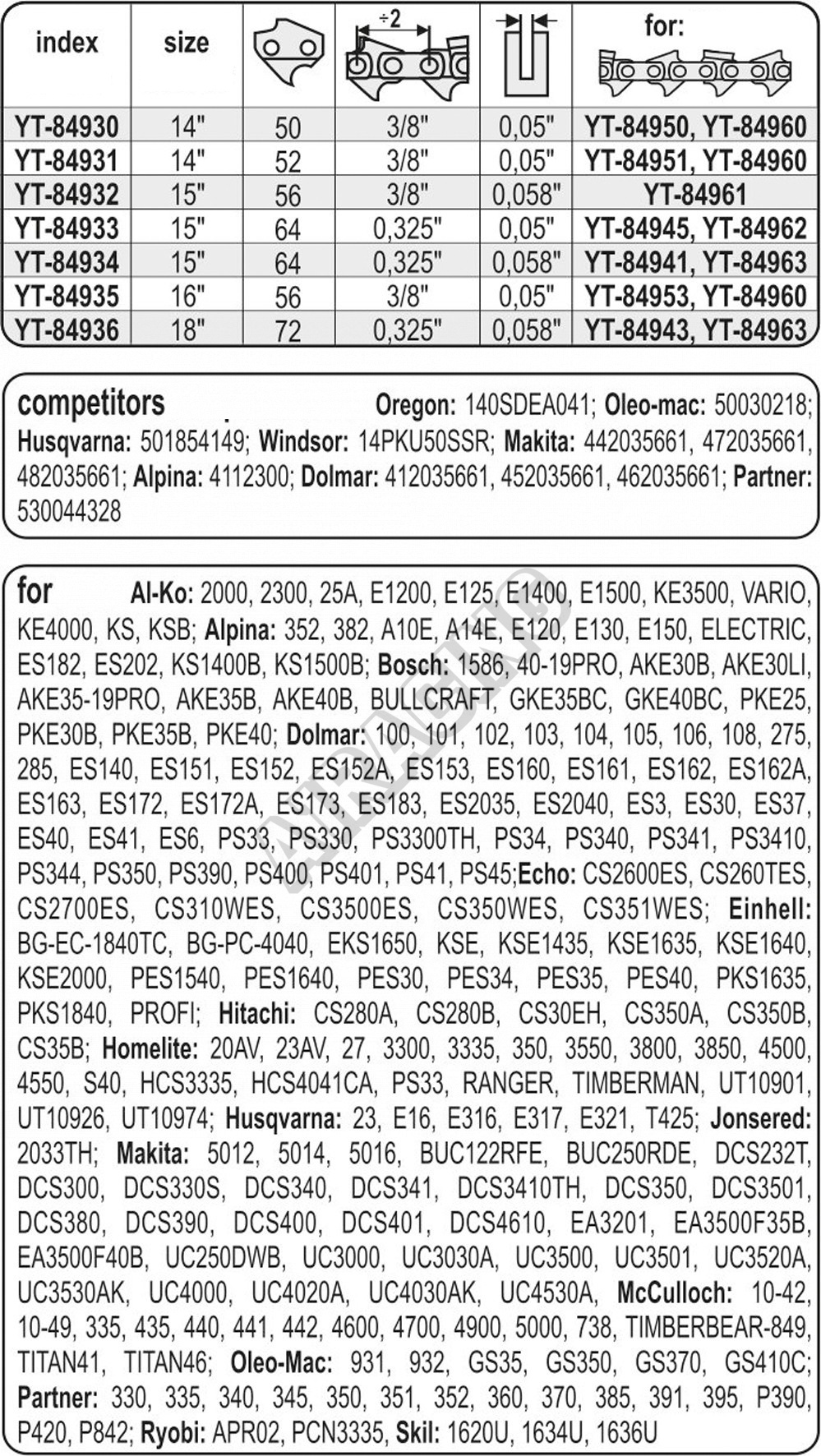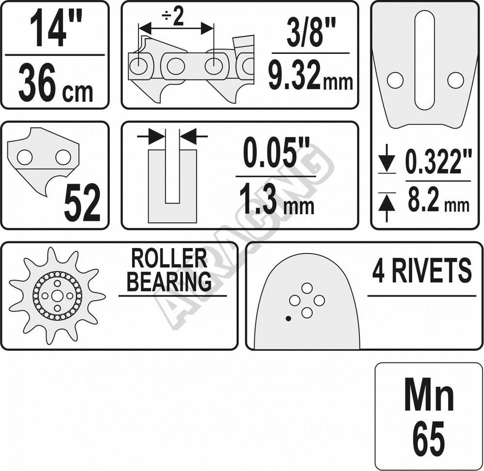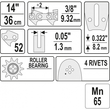 Vodící lišta pro motorovou pilu délky 14" s roztečí 3/8", šířkou 0,05" (1,3 mm) s 52 články. Vodící lišta je vhodná pro použití s řetězem YT-84951 na motorové pile YT-82812.