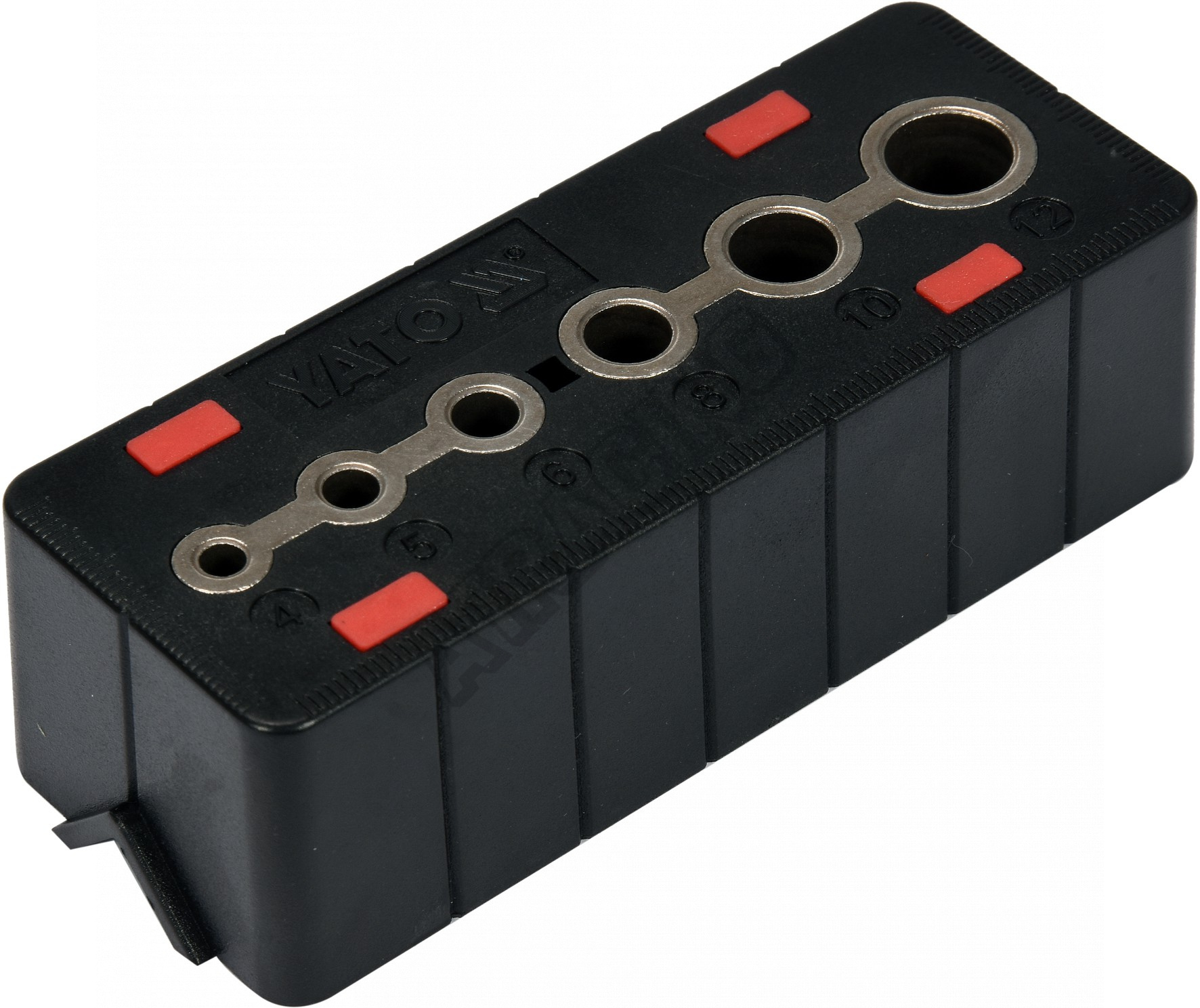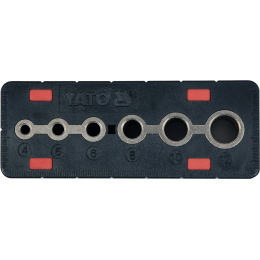 Vyrobena z odolného plastu (ABS) a 6 otovrů z uhlíkové oceli pro vrtáky o průměrech 4, 5, 6, 8, 10 a 12 mm.