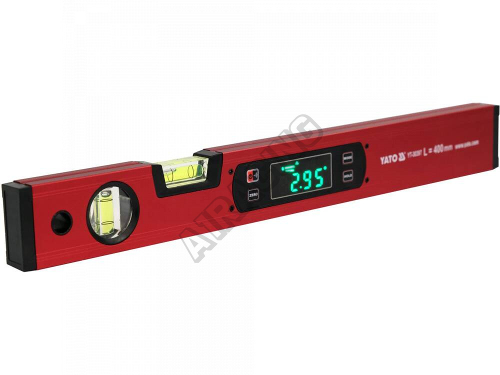 Elektronická vodováha s eloxovaným hliníkovým tělem.