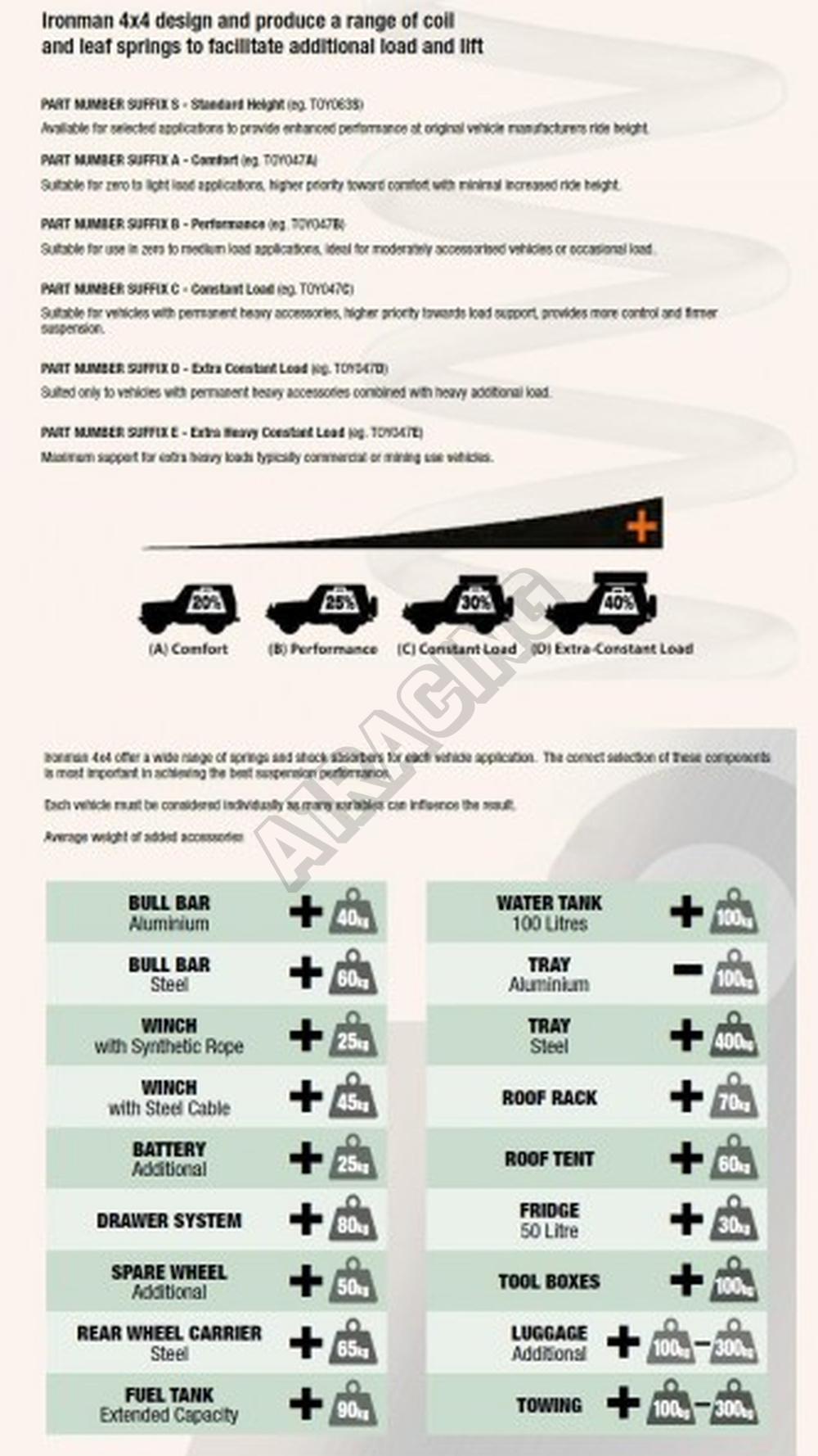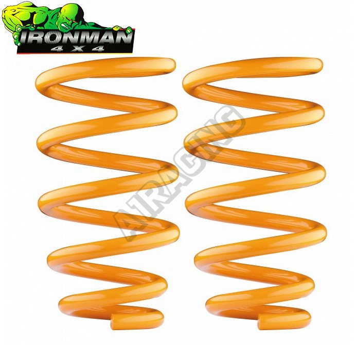 Kvalitní zesílené přední a zadní pružiny kutovního australského výrobce Ironman 4x4 vyrobené ze speciální oceli vinuté za studena. Tímto způsobem decentně zvednete podvozek vašeho auta bez žádných dalších úprav, kde jen pružiny vyměníte za originální. Světlá výška auta po instalaci se zvedne + 30 mm. Přední a zadnbí náprava je navíc posílena o 50-110 kg, Auto po této instalaci zvýšených pružin IRONMAN4X4 sneze větší zatížení a přitom neztratí nic ze svého komfortu. Cena je vždy za 1 sadu 2 kusů pružin na přední nebo zadní nápravu.