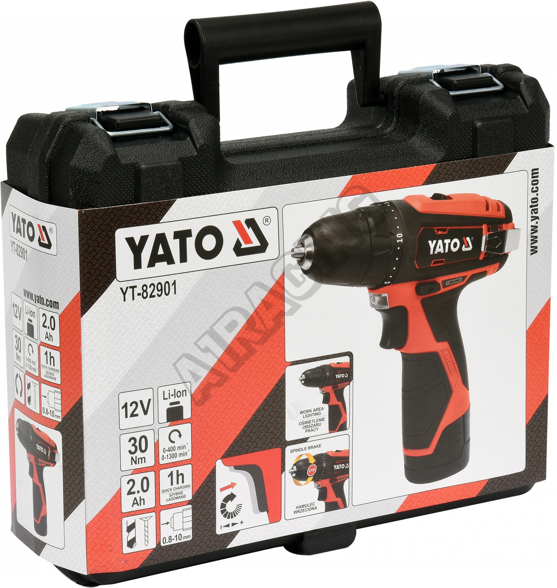 Kompaktní AKU vrtačka/šroubovák YATO o síle 12V (max. otáček 1300 za minutu).