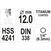 Vyrobeno z rychlořezné HSS oceli s Titanovým povlakem a vrcholovým úhlem 135°. Vrták je opatřen HEX 1/4" uchycením.
