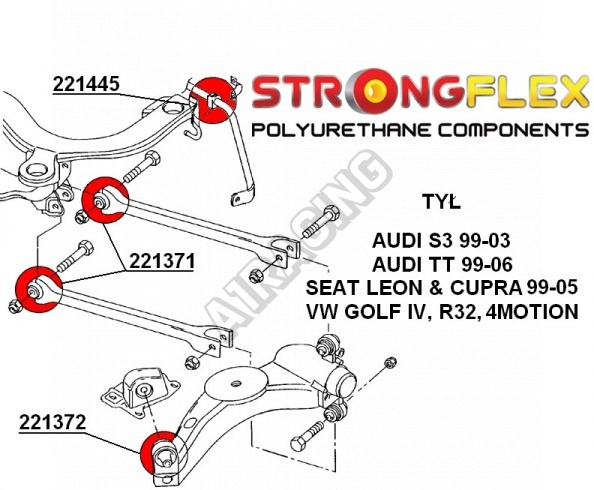 VW Golf IV 1997-2003 R32 StrongFlex (tvrdost 80ShA) kompletní sestava silentbloků na celé auto obsahuje :