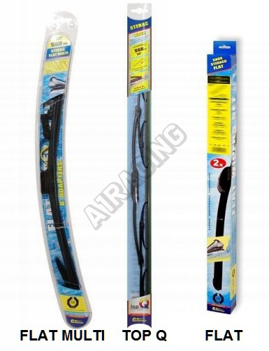 Stěrače FLAT SET (sada 2 ks na celé auto). Vysoce kvalitní pružný člen plochého stěrače zajišťuje stejnoměrný tlak grafitového břitu v celé jeho délce, což zamezuje rozmazávání nečistot a vytváření pruhů.