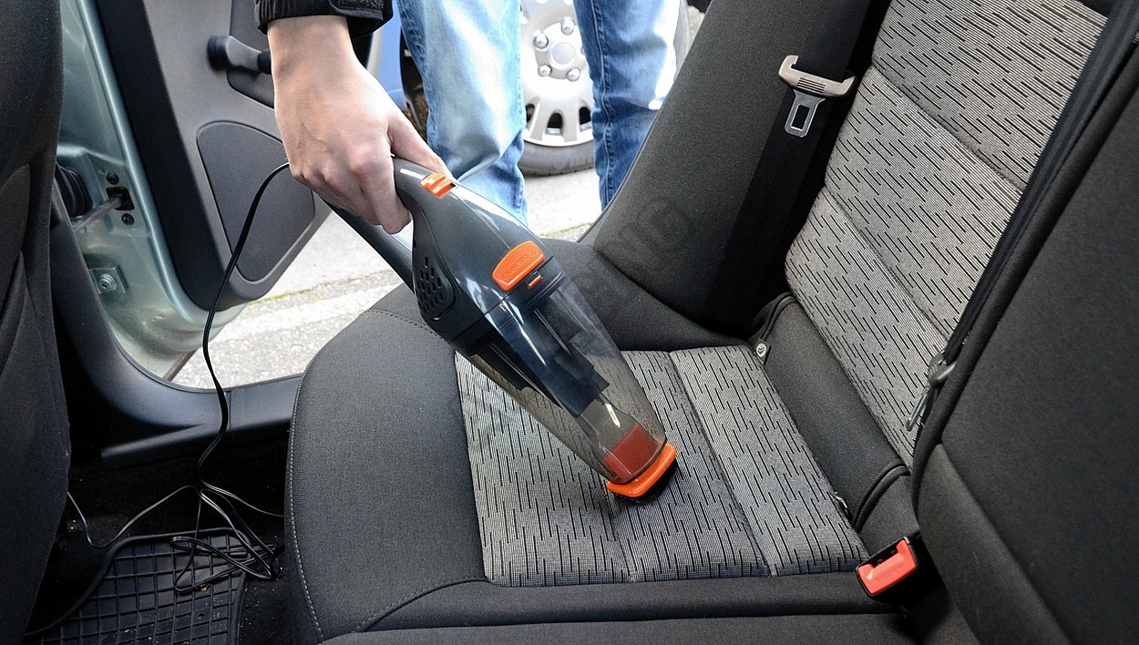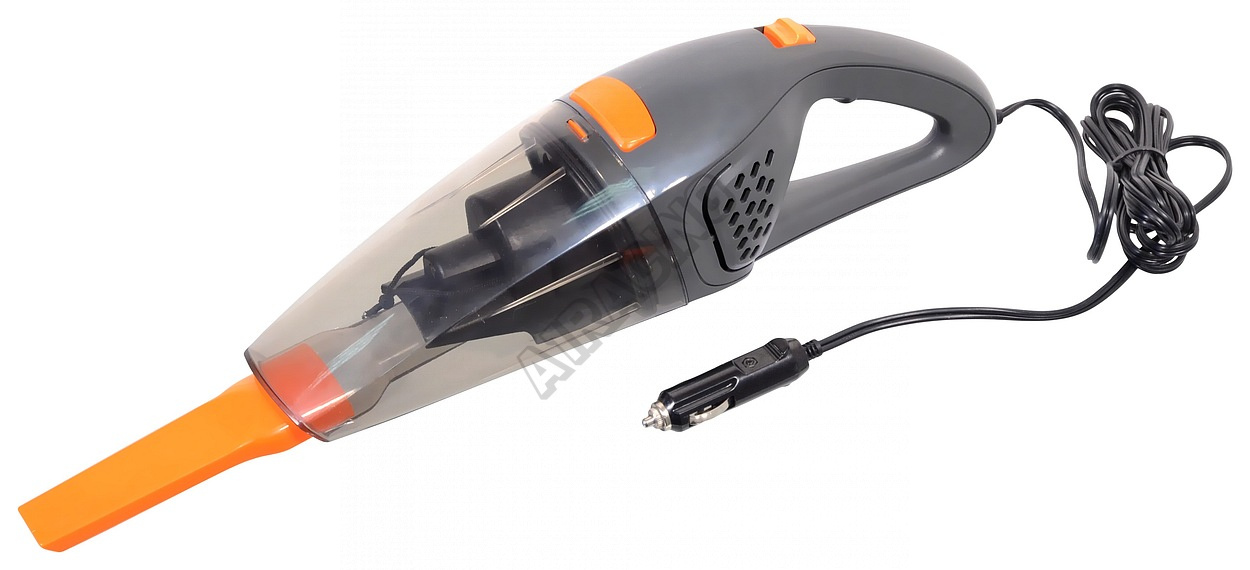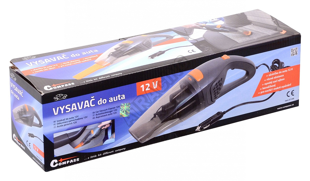 Přenosný vysavač, vybavený dlouhým kabelem a se zástrčkou do zásuvky automobilového zapalovače 12V.