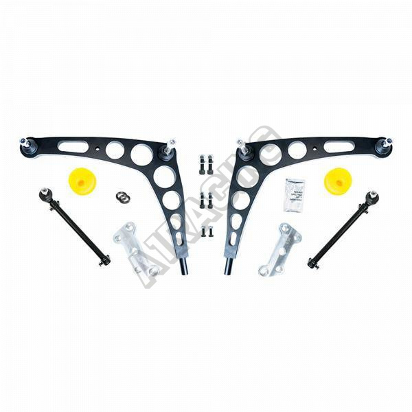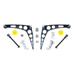 Adaptery frezowane są na maszynach CNC, co daje wysoką jakość wykończenia i 100 % dopasowanie adaptera do zwrotnicy i końcówek sworzni. Dla E36 adaptery wykonane są z najtwardszego aluminium wg. polskich standardów. Wahacz jest cięty laserem i posiada precyzyjnie obrobione otwory pod sworznie i mocowanie stabilizatora (zalecamy jego montaż dla lepszego prowadzenia samochodu w poślizgu, szczególnie gdy zawieszenie nie jest “zbetonowane”).