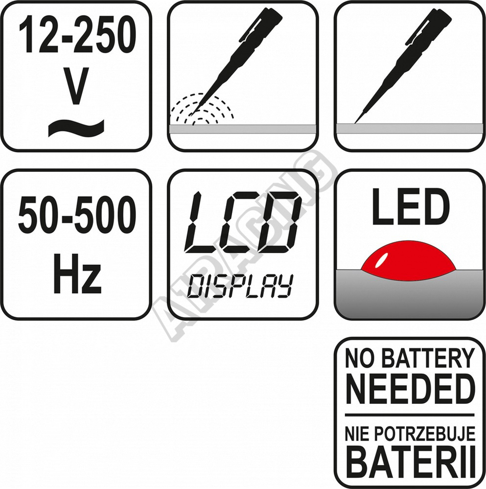 Zkoušečka napětí v rozsahu 12 - 250 V. Indikátor je určen pro mechaniky, kontrolory provádějící údržbu elektrických instalací i pro „běžné uživatele domácích zásuvek“.